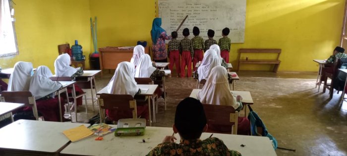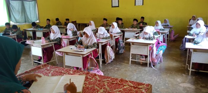 Dewan guru menulis materi pelajaran di papan tulis, yang kemudian langsung disalin oleh para siswa. Setelah selesai, hasil tulisan siswa dikumpulkan untuk dikoreksi oleh guru. Guru juga secara aktif memantau jalannya pembelajaran, memastikan setiap siswa terlibat dengan baik. Jika terdapat siswa yang kurang fokus atau membuat keributan, guru segera memberikan arahan dan motivasi agar mereka kembali mengikuti pelajaran dengan semangat.