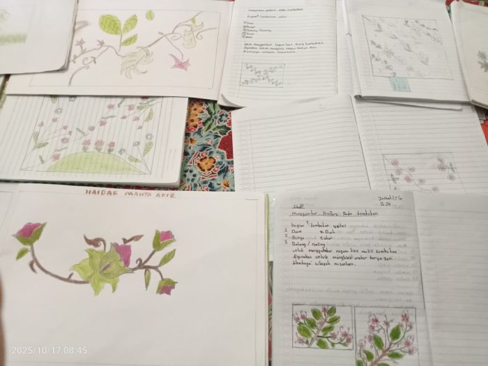 Dalam pembelajaran ini, siswa kelas 6A diberikan tugas untuk membuat motif hias di atas buku, sesuai dengan imajinasi masing-masing namun tetap mengikuti panduan yang telah diberikan oleh guru. Tujuan utama dari pembelajaran motif hias ini adalah agar siswa mampu menambah nilai keindahan pada karya yang mereka buat, sekaligus melatih kreativitas dan keterampilan seni mereka.