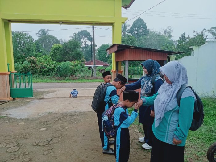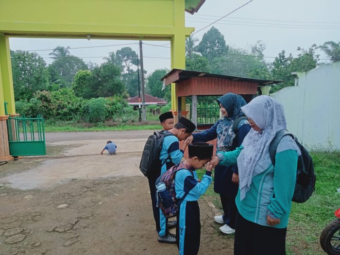 Setiap siswa yang datang memasuki gerbang madrasah disambut dengan bersalaman secara tertib dan rapi bersama para guru. Interaksi ini tidak hanya mempererat hubungan antara guru dan siswa, tetapi juga menanamkan nilai sopan santun dan kedisiplinan sejak dini.