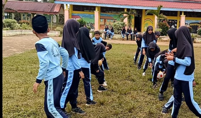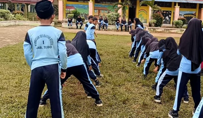 Siswa Madrasah Ibtidaiyah Negeri (MIN) 1 Tebo mengikuti kegiatan permainan estafet bola dengan penuh semangat di lingkungan madrasah. Kegiatan ini diadakan sebagai salah satu cara untuk mengisi waktu luang setelah para siswa menyelesaikan pelajaran Pendidikan Jasmani, Olahraga, dan Kesehatan (PJOK).
