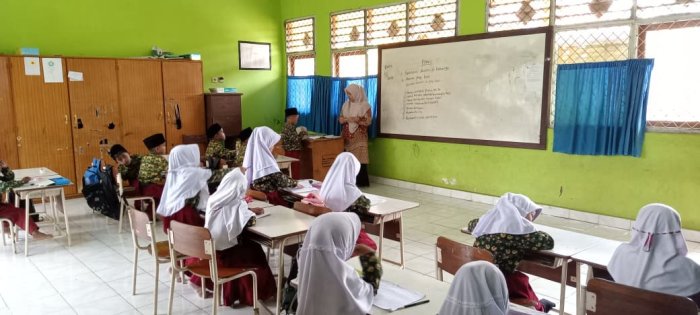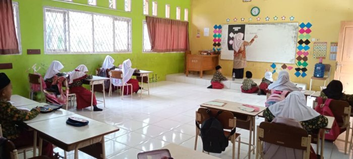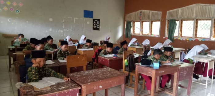 Dewan guru yang mengajar di kelas rendah segera mengondisikan siswa agar siap mengikuti pembelajaran. Selama proses belajar, para siswa tampak antusias dan sungguh-sungguh dalam menerima materi yang disampaikan. Wali kelas menuliskan materi pelajaran di papan tulis, sementara siswa menyalin materi tersebut dengan tekun sebagai bagian dari latihan menulis yang rapi hingga selesai.