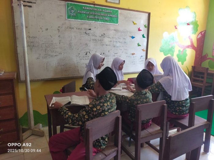 Pada Kamis, 30 Oktober 2025, siswa kelas 6B MIN 1 Tebo mengikuti kegiatan pembelajaran Bahasa Indonesia bersama wali kelas, Bapak Suyono, S.Pd.I. Kegiatan ini berlangsung di perpustakaan madrasah, memberikan suasana belajar yang berbeda dari biasanya. Dalam pembelajaran kali ini, para siswa mendapat tugas membuat kamus kecil yang ditulis langsung di buku latihan masing-masing.