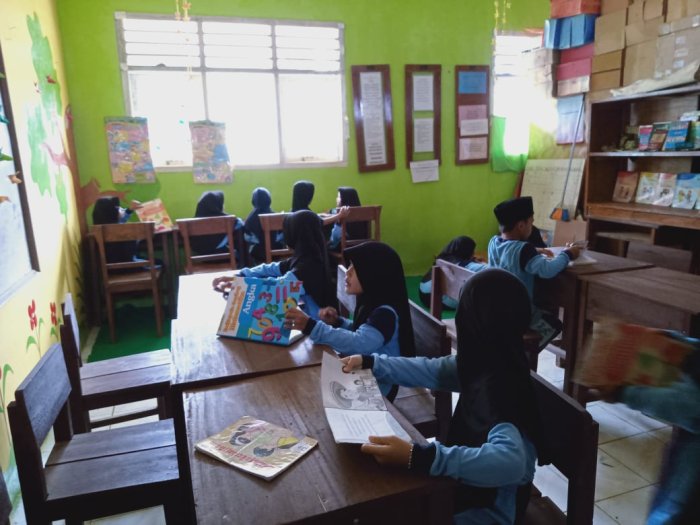 Kunjungan ke perpustakaan biasanya dilakukan pada pukul 09.15 WIB, setelah waktu istirahat. Siswa kelas 2 memasuki ruang perpustakaan secara tertib dan mengisi buku kunjungan sebagai bukti keaktifan mereka. Ibu Fadliah menyambut siswa dengan ramah dan mengarahkan mereka untuk memilih buku dengan hati-hati agar koleksi tetap terjaga. Di dalam perpustakaan, siswa laki-laki umumnya memilih buku cerita dan buku Ilmu Pengetahuan Alam (IPA), sementara siswa perempuan lebih banyak membaca atlas dan buku Bahasa Indonesia yang berkaitan dengan materi pembelajaran. Kursi-kursi yang tersedia di perpustakaan dimanfaatkan siswa untuk membaca dengan nyaman. Semangat dan antusiasme siswa terlihat jelas saat mereka menikmati kegiatan literasi ini.