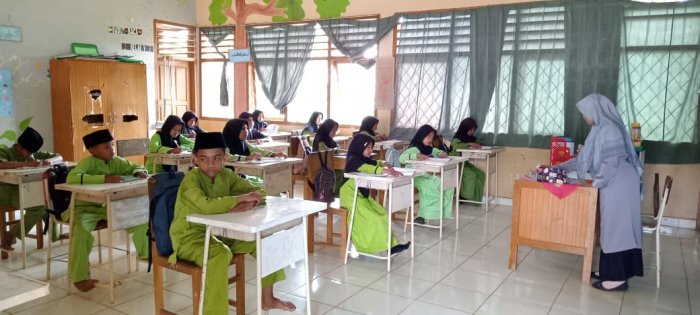 Pembelajaran dimulai setelah dewan guru memasuki kelas. Pada hari yang sama, siswa kelas rendah juga fokus belajar dengan membahas soal-soal dari buku LKS dan mengerjakannya dengan tekun. Dewan guru yang mengajar di kelas tinggi tampak aktif menjelaskan materi pembelajaran. Para siswa memperhatikan penjelasan guru dengan serius, menunjukkan komitmen mereka dalam memahami materi yang diberikan. Interaksi antara guru dan siswa berlangsung baik. Saat guru memberikan pertanyaan, siswa mampu menjawab dengan tepat, menandakan pemahaman yang baik terhadap materi. Guru juga memastikan setiap siswa benar-benar memahami pelajaran dengan memberikan latihan soal dari buku LKS yang telah disediakan. Siswa mengerjakan latihan tersebut dengan sungguh-sungguh untuk meraih hasil terbaik.