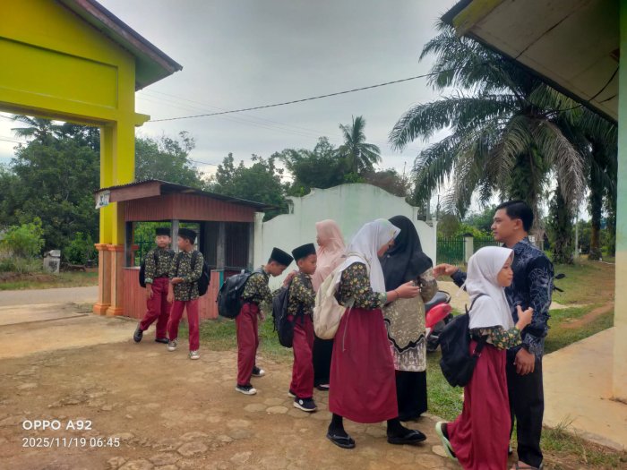 Pada Rabu, 19 November 2025, dewan guru Madrasah Ibtidaiyah Negeri (MIN) 1 Tebo kembali melaksanakan kegiatan pembiasaan piket pagi di gerbang madrasah. Kegiatan ini merupakan rutinitas yang dilakukan setiap hari sesuai jadwal yang telah ditetapkan oleh pihak sekolah. Tujuannya adalah untuk membentuk karakter disiplin siswa sejak dini melalui penyambutan langsung oleh para guru di pintu masuk madrasah. Setiap pagi, sekitar tiga hingga empat guru telah bersiap di gerbang untuk menyambut kedatangan siswa. Kehadiran para guru ini tidak hanya menunjukkan semangat pagi, tetapi juga menjadi bagian dari komitmen bersama untuk menciptakan lingkungan madrasah yang harmonis dan kondusif. Guru-guru yang bertugas pada hari itu antara lain Bapak Suyono, S.Pd.I, Ibu Dwi Hastuti, S.Pd, dan Ibu Nemawani, S.Pd.I. Selain guru yang piket, beberapa guru lain juga hadir untuk mengikuti kegiatan penyambutan, menandakan kekompakan dan rasa tanggung jawab yang tinggi di antara dewan guru.