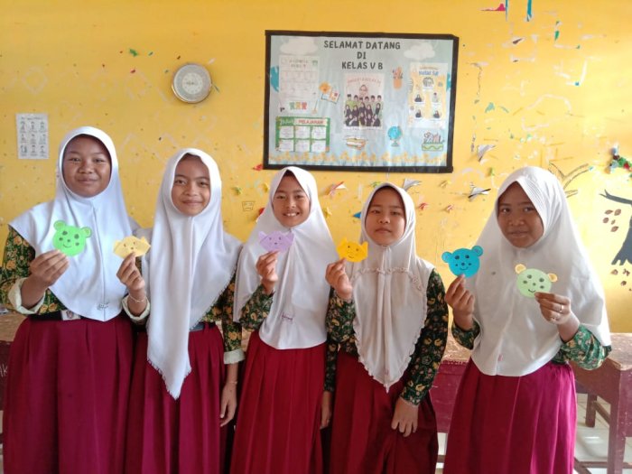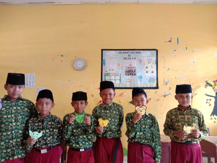 Pada kesempatan ini, siswa kelas 5B melakukan praktik membuat kepala koala menggunakan kertas origami. Praktik ini dilakukan sesuai langkah-langkah yang tertera di buku Lembar Kerja Siswa (LKS). Siswa dibagi menjadi tiga kelompok, masing-masing terdiri dari beberapa anggota. Alat dan bahan yang digunakan antara lain kertas origami, lem kertas, pensil, penghapus, spidol, gunting, dan penggaris. Seluruh siswa tampak antusias mengikuti pembelajaran. Mereka duduk melingkar bersama kelompok di lantai kelas dan bekerja sama untuk menghasilkan karya terbaik. Guru turut mengamati jalannya praktik dan memberikan bimbingan langsung. Jika ada siswa yang belum memahami instruksi, mereka dapat bertanya langsung kepada guru agar proses pembelajaran berjalan lancar.