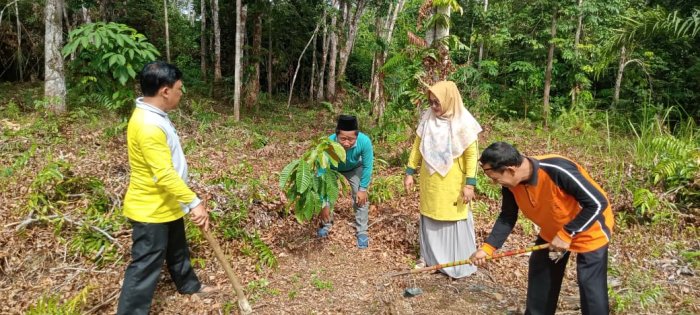 Dewan guru Madrasah Ibtidaiyah Negeri (MIN) 1 Tebo secara aktif melakukan pemantauan dan perawatan terhadap pohon buah-buahan yang ditanam di lingkungan madrasah, khususnya di area belakang. Jenis pohon yang dirawat meliputi pisang, kelapa, alpukat, matoa, nanas, dan kelengkeng. Kegiatan ini dilakukan secara rutin untuk memastikan tanaman tumbuh dengan baik dan sehat, sehingga diharapkan nantinya dapat berbuah serta memberi manfaat bagi seluruh keluarga besar MIN 1 Tebo. Penanaman buah matoa dilaksanakan langsung oleh Kepala MIN 1 Tebo Bapak H. Ruslani, S.Pd., M.M bersama dewan guru MIN 1 Tebo yang merupakan bagian dari program penanaman 1.000 pohon yang telah dilaksanakan pada April lalu. Program ini menjadi simbol kepedulian madrasah terhadap pelestarian lingkungan dan upaya penghijauan di kawasan madrasah.