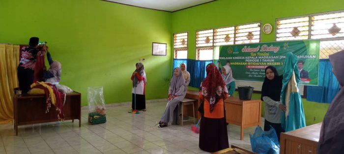 Pada Jumat, 28 November 2025, seluruh dewan guru MIN 1 Tebo menunjukkan kekompakan dalam melaksanakan tugas membersihkan lingkungan madrasah. Kegiatan ini merupakan bagian dari upaya menjaga kebersihan yang telah menjadi kewajiban bagi seluruh warga MIN 1 Tebo. Kegiatan bersih-bersih ini dilakukan setelah siswa mengikuti pembiasaan Istighosah bersama di aula madrasah. Setelah acara keagamaan tersebut selesai, para guru langsung bergerak untuk membersihkan ruangan yang akan digunakan sebagai tempat pelaksanaan Penilaian Kinerja Kepala Madrasah (PKKM). Penilaian ini dijadwalkan berlangsung pada Selasa, 2 Desember 2025.