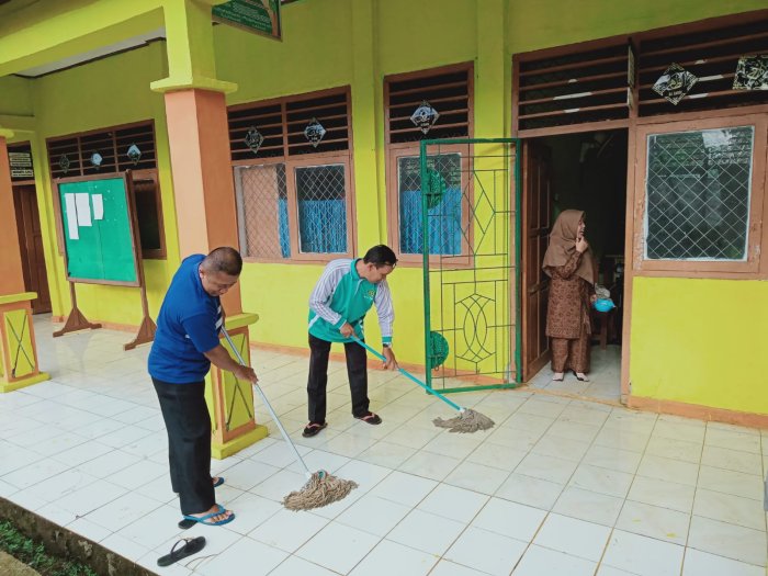 Beberapa guru seperti Bapak Ariyanto, S.Pd.I, dan Bapak Aswadi, S.Pd.I terlihat aktif dalam membersihkan lingkungan teras madrasah. Mereka tidak hanya mengepel lantai, tetapi juga menyapu dan mengumpulkan sampah di sekitar teras untuk memastikan area tetap bersih dan rapi. Selain itu, sebelum kegiatan pembelajaran dimulai, dewan guru juga menyapu dan mengepel halaman madrasah agar lingkungan tetap nyaman dan kondusif untuk belajar. Kegiatan menjaga kebersihan ini tidak hanya melibatkan dewan guru, tetapi juga seluruh siswa. Para siswa turut serta dengan berbagi tugas membersihkan area lapangan, depan kantor, dan taman madrasah. Gotong royong ini bertujuan untuk menciptakan suasana belajar yang sehat dan mendukung konsentrasi siswa dalam menuntut ilmu.