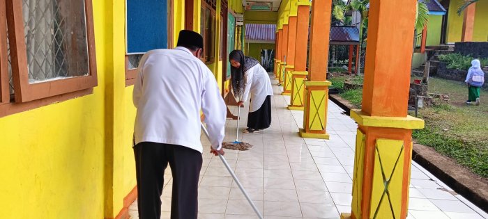 Pada Senin, 1 Desember 2025, Madrasah Ibtidaiyah Negeri (MIN) 1 Tebo menunjukkan komitmen tinggi terhadap kebersihan lingkungan dengan melaksanakan kegiatan panca cinta lingkungan. Kegiatan ini menjadi rutinitas harian yang melibatkan seluruh dewan guru dan warga madrasah. Setiap pagi, setelah tiba di madrasah, para guru langsung bersama-sama membersihkan lingkungan sekitar. Mereka tidak hanya menyapu dan mengepel lantai, tetapi juga memastikan area teras tetap kering dan bersih, terutama setelah siswa mengambil air wudhu yang kerap membuat lantai menjadi basah. Guru-guru seperti Bapak Ariyanto, Bapak Aswadi, S.Pd.I, dan Ibu Fadliah Jumroh, S.Pd, terlihat aktif dalam menjaga kebersihan teras dan sekitarnya.