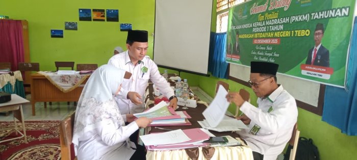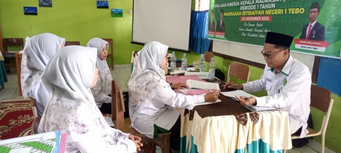 Pada Selasa, 2 Desember 2025, seluruh dewan guru dan staf Madrasah Ibtidaiyah Negeri (MIN) 1 Tebo melaksanakan kegiatan Penilaian Kinerja Kepala Madrasah (PKKM) dengan penuh tanggung jawab. Kegiatan ini berlangsung setelah para guru menyelesaikan tugas sebagai pengawas pada pelaksanaan sumatif akhir semester ganjil di hari kedua. PKKM tahun 2025 di MIN 1 Tebo menjadi agenda penting dalam upaya meningkatkan mutu manajemen dan profesionalisme di lingkungan madrasah.