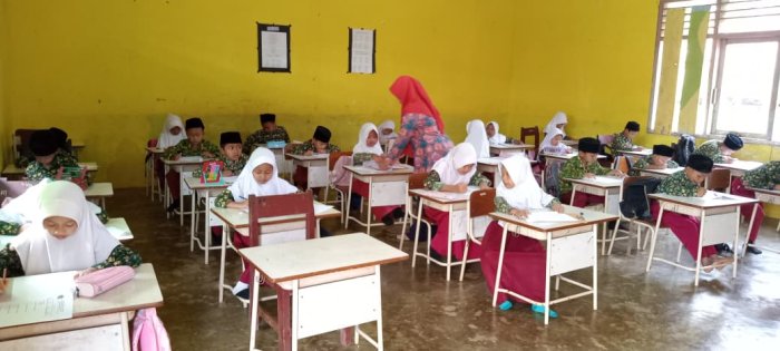 Seluruh siswa kelas rendah tampak serius dan fokus dalam mengerjakan soal. Mereka berusaha menjawab setiap pertanyaan dengan mandiri tanpa melihat jawaban teman. Suasana kelas tetap kondusif dan menyenangkan, meskipun para siswa menunjukkan keseriusan dalam mengikuti ujian. Mereka juga mengikuti arahan guru dengan baik selama proses ujian berlangsung. Setelah selesai mengerjakan soal, siswa duduk dengan tenang sambil menunggu teman-teman lainnya menyelesaikan ujian. Sembari menunggu, mereka memanfaatkan waktu dengan membaca buku pelajaran, yang juga menjadi bagian dari kegiatan rutin di MIN 1 Tebo untuk meningkatkan kemampuan membaca siswa. Jika ada soal atau tulisan yang kurang dipahami, siswa aktif bertanya kepada guru untuk mendapatkan penjelasan lebih lanjut.