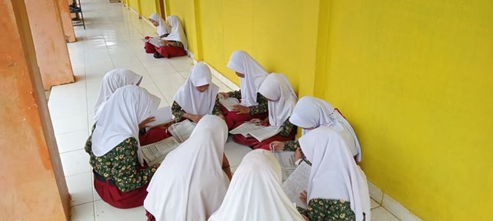 Pada Rabu, 3 Desember 2025, siswa Madrasah Ibtidaiyah Negeri (MIN) 1 Tebo menunjukkan antusiasme tinggi dalam mempersiapkan diri menghadapi sumatif akhir semester ganjil. Kegiatan belajar bersama ini dilakukan saat jam istirahat, tepat sebelum pelaksanaan ujian mata pelajaran Matematika yang dijadwalkan pada jam kedua. Para siswa memanfaatkan waktu istirahat dengan berkumpul di taman madrasah yang terawat maupun di teras kelas masing-masing. Mereka tampak serius mendiskusikan materi pelajaran, saling membantu memahami soal-soal, namun tetap menjaga suasana santai dan penuh kebersamaan. Setelah membeli makanan di kantin, para siswa segera mengambil buku dan melanjutkan belajar bersama, menunjukkan komitmen mereka dalam menuntut ilmu.