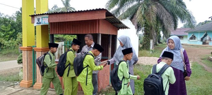 Pada Jumat, 5 Desember 2025, dewan guru Madrasah Ibtidaiyah Negeri (MIN) 1 Tebo kembali melaksanakan rutinitas pagi dengan menyambut kehadiran siswa di gerbang madrasah. Kegiatan ini merupakan bagian dari upaya sekolah untuk memotivasi siswa agar semangat menuntut ilmu, serta menanamkan nilai kedisiplinan, sopan santun, dan tanggung jawab sejak dini. Setiap pagi, dewan guru yang bertugas piket hadir lebih awal di gerbang madrasah, mulai pukul 06.20 WIB. Dewan guru menyambut siswa dengan ramah dan penuh semangat. Pada hari ini, dewan guru yang bertugas adalah Bapak Ariyanto, S.Pd.I, Ibu Nurul Aeni, S.Pd.I, dan Ibu Dharmawati, S.Ag. Kehadiran mereka di pintu gerbang tidak hanya untuk menyambut siswa, tetapi juga untuk memastikan tidak ada siswa yang terlambat, karena gerbang madrasah akan ditutup pada pukul 07.10 WIB.
