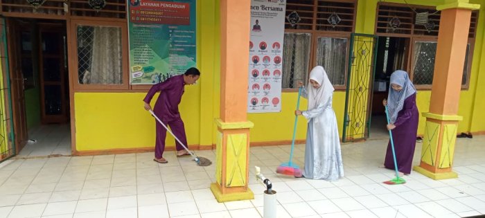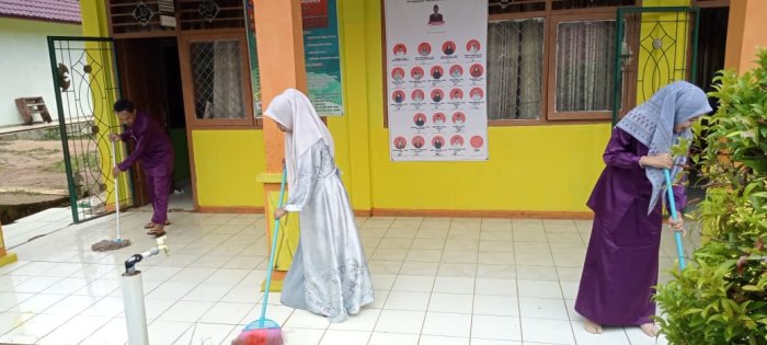 Pada Jumat, 5 Desember 2025, keluarga besar Madrasah Ibtidaiyah Negeri (MIN) 1 Tebo memperlihatkan komitmen tinggi terhadap kebersihan lingkungan madrasah. Mereka secara rutin menerapkan panca cinta lingkungan sebagai bagian dari tanggung jawab bersama. Kegiatan ini dilakukan setiap hari setelah dewan guru tiba di madrasah, menandakan kepedulian terhadap fasilitas dan lingkungan sekitar. Para guru, seperti Ibu Ainun Mahmuda, S.Pd, Bapak Aswadi, S.Pd.I, dan Ibu Fadliah Jumroh, S.Pd, terlihat aktif membersihkan area teras madrasah. Dewan bersama-sama mengepel lantai, menyapu, dan mengambil sampah di sekitar teras. Upaya ini dilakukan agar lingkungan madrasah selalu tampak rapi dan bersih, terutama karena area teras merupakan salah satu bagian yang paling sering digunakan oleh warga madrasah.