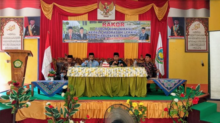 Kegiatan forum komunitas kepala madrasah ini juga digelar sebagai ajang silaturahmi yang dapat menciptakan lingkungan yang penuh cinta dan saling mendukung antar kepala madrasah. Kepala Kantor Kemenag Tebo Bapak H. Julan, S.Ag., M.Pd.I dalam sambutannya menyampaikan beberapa hal penting yaitu mengingatkan kembali mengenai ketertiban disiplin kehadiran pada satuan kerja di masing-masing madrasah, Beliau juga menyampaikan bahwa sebagai seorang guru harus mengajar dengan penuh keikhlaksan dan kesabaran, serta selalu meningkatkan rasa syukur menjadi seorang ASN. Dalam kesempatan ini rapat koordinasi ini juga membahas mengeni Rapor Digital Madrasah (RDM) yang sekarang tengah diisi oleh para dewan guru pada satuan pendidikan masing-masing madrasah setelah selesai melaksanakan sumatif akhir semester ganjil tahun ajaran 2025/2026.