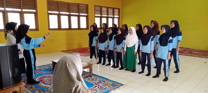 Latihan pada hari ini dilaksanakan dengan sukses yang di pandu langsung oleh dewan guru yaitu Ibu Rahmawani S.Pd, dan Ibu Dwi Hastuti, S.Pd. Kepala MIN 1 Tebo Bapak H. Ruslani, S.Pd., M.M, beliau mengimbau kepada siswa yang mengikuti lomba agar melaksanakan latihan dengan sungguh-sungguh dan serius agar kekompakan terus di terapkan sehingga dapat menampilkan yang terbaik pada saat kegiatan lomba berlangsung. Kepala madrasah juga mengimbau kepada dewan guru untuk selalu melatih dan mendampingi siswa dalam kegiatan lomba paduan suara ini. Tampak di ruang aula madrasah, para siswa telah melaksanakan latihan dan sudah hafal dengan lagu-lagu yang akan di lombakan. Terdapat 2 lagu dilombakan ada 2 yaitu lagu wajib nasional dan juga lagu daerah. Seluruh siswa menunjukkan keantusiasan dan keseriusan dalam kegiatan latihan ini agar dapat menampilkan yang terbaik dan membawa nama MIN 1 Tebo dengan memperoleh juara.