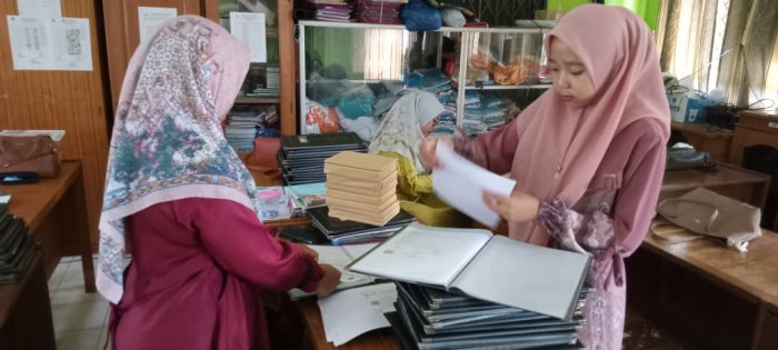 Pada Jumat, 19 Desember 2025 suasana lingkungan di madrasah tampak hangat dan semangat. Tampak siswa MIN 1 Tebo sedang melaksanakan kegiatan di madrasah baik kegiatan olahraga maupun latihan paduan suara oleh siswa yang mengikuti lomba. Sedangkan dewan guru MIN 1 Tebo tampak sedang sibuk menyusun rapor yang akan dibagikan secara langsung pada Sabtu, 20 Desember 2025 di madrasah. Seluruh rapor siswa MIN 1 Tebo dari kelas 1 sampai dengan kelas 6 telah selesai di tanda tangani oleh Kepala MIN 1 Tebo Bapak H. Ruslani, S.Pd., M.M dan telah di stempel oleh Staf TU madrasah. Pada hari ini tampak dewan guru sedang menyusun rapor dan memasukkan nilai ke dalam buku sampul rapor. Dewan guru juga mengecek nama-nama siswa untuk menghindari terjadinya kekeliruan siswa antar kelas.