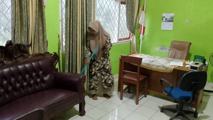 Dua dewan guru yang turut aktif dalam kegiatan ini adalah Ibu Nurhidayah, S.Pd.I dan Ibu Falikhatus Saadah, S.Pd. Dengan penuh semangat, mereka tidak hanya menjalankan tugas administrasi, tetapi juga membersihkan ruang kantor guru. Hal ini dilakukan agar ruang kantor tetap bersih dan nyaman, meskipun sedang dalam masa libur sekolah. Selain ruang kantor guru, teras madrasah juga dibersihkan dengan baik. Langkah ini diambil untuk memastikan bahwa lingkungan madrasah selalu dalam keadaan bersih dan rapi, terutama jika ada siswa yang datang mengambil ijazah atau tamu dari luar yang berkunjung ke madrasah.