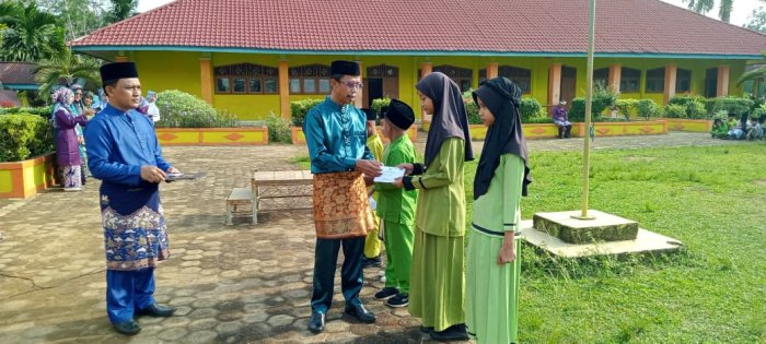 Selain memperingati HUT Provinsi Jambi, pada kesempatan yang sama, Kepala MIN 1 Tebo juga menyerahkan bantuan dari Baznas secara langsung kepada lima siswa yatim di madrasah. Bantuan ini diharapkan dapat membantu siswa dalam memenuhi kebutuhan perlengkapan sekolah seperti buku, seragam, sepatu, dan tas. Lima siswa penerima bantuan tersebut adalah Faiz Septiando, Raka Bagus Wicaksono, Muhammad Bayu Saputra, Putri Nur Anggraini, dan Qinara Shakila Hapsari. Penyerahan bantuan dilakukan secara bergantian oleh Kepala MIN 1 Tebo. Para siswa penerima tampak bahagia dan bersyukur atas bantuan yang diberikan, karena bantuan tersebut sangat membantu mereka dalam memenuhi kebutuhan sekolah.