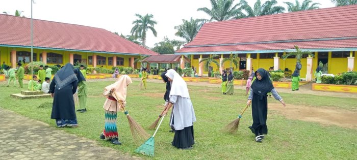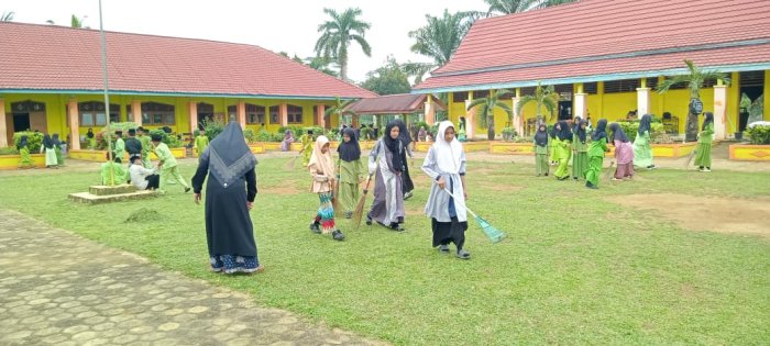 Seluruh siswa tampak antusias membagi tugas, seperti menyapu lantai, mengepel, mengambil sampah, membersihkan taman madrasah, serta membersihkan area selokan. Kerja sama antar siswa diharapkan dapat menciptakan ruang kelas yang bersih dan rapi, sehingga mendukung proses belajar mengajar. Selain siswa, dewan guru juga aktif dalam kegiatan gotong royong. Mereka membersihkan area rumput di depan ruang kantor hingga lapangan madrasah. Beberapa guru, seperti Bapak Suyono, S.Pd.I dan Bapak Aswadi, S.Pd.I, menggunakan mesin pemotong rumput untuk mempercepat proses pembersihan. Rumput yang telah dipotong kemudian disapu dan dikumpulkan untuk dibuang ke tempat sampah yang telah disediakan di belakang madrasah.
