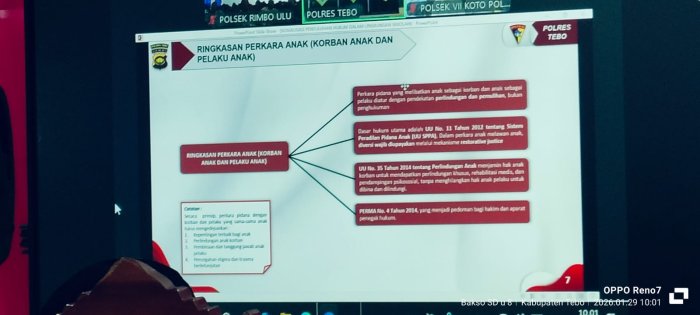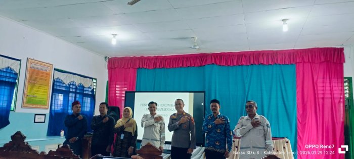 Wakil Kepala Koordinator Bidang Kesiswaan MIN 1 Tebo, Ibu Siti Normawadah, S.Pd.I, menghadiri kegiatan sosialisasi penyuluhan hukum yang berlangsung di Polsek Kecamatan Rimbo Ulu. Kehadiran Ibu Siti Normawadah, S.Pd.I untuk mewakili Kepala MIN 1 Tebo, Bapak H. Ruslani, S.Pd., M.M, yang pada waktu bersamaan harus mengikuti acara penting . Kegiatan sosialisasi ini dilaksanakan pada Kamis, 29 Januari 2026, mulai pukul 09.00 WIB hingga selesai. Acara tersebut dihadiri oleh sejumlah guru dan perwakilan sekolah di wilayah Kecamatan Rimbo Ulu. Materi sosialisasi disampaikan langsung oleh Kepala Kepolisian Resor Tebo, AKPD Triyanto, S.I.K., S.H., M.H. Dalam paparannya, AKPD Triyanto menggunakan presentasi power point untuk menjelaskan berbagai aspek hukum yang relevan dengan lingkungan sekolah.