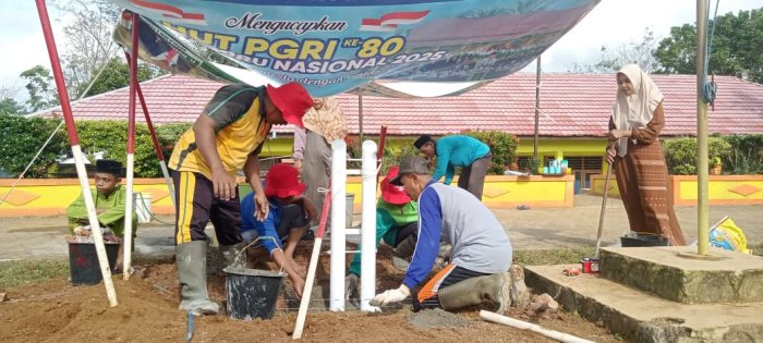 Pada Jumat, 30 Januari 2026, Kepala MIN 1 Tebo, Bapak H. Ruslani, S.Pd., M.M, bersama dewan guru melaksanakan pembaruan tiang bendera di lapangan madrasah. Kegiatan ini merupakan bagian dari program kerja kepala madrasah untuk memperbaiki dan memperkuat sarana upacara bendera di lingkungan madrasah. Pembaruan tiang bendera dilakukan agar tiang yang digunakan untuk mengibarkan bendera merah putih menjadi lebih tinggi dan kokoh. Proses pengerjaan melibatkan gotong royong antara kepala madrasah dan seluruh dewan guru. Kepala madrasah dan dewan guru bersama-sama membuat lubang untuk tiang, mengambil pasir, mengaduk semen, hingga melakukan pengecoran pada bagian dasar tiang agar berdiri dengan kuat.