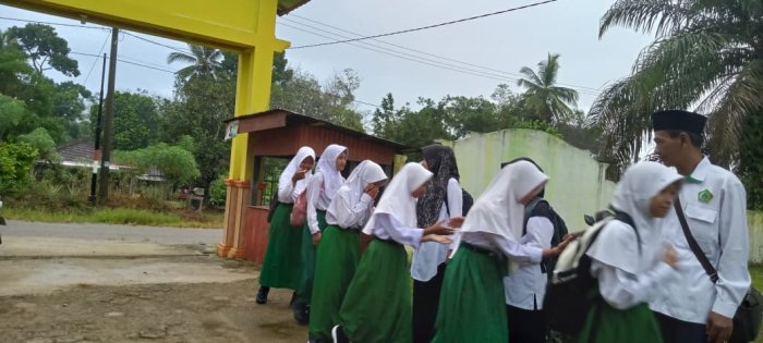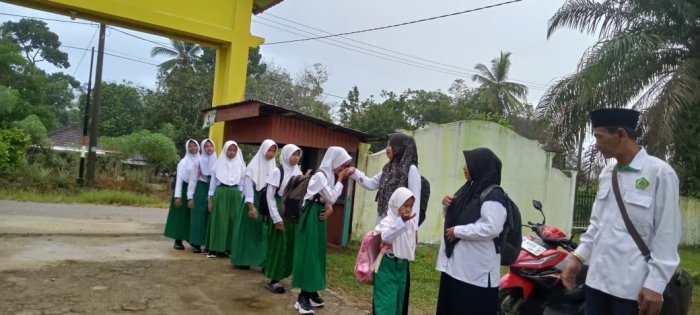 Pada hari ini, dewan guru yang bertugas menyambut siswa adalah Bapak Sri Budiyono, S.Pd.I, Ibu Nurhidayah, S.Pd.I, Ibu Ainun Mahmuda, S.Pd, dan Ibu Rahmawani Maghfirah, S.Pd. Selain guru yang mendapat jadwal piket, beberapa guru lain juga turut hadir, menunjukkan kekompakan dan komitmen dewan guru dalam melaksanakan tugas dengan penuh tanggung jawab. Kegiatan penyambutan siswa berlangsung lancar. Para siswa datang bersama orang tua mereka hingga ke gerbang, kemudian bersalaman dengan guru yang sudah siap menyambut. Suasana pagi yang sejuk turut menambah semangat baik bagi guru maupun siswa untuk memulai aktivitas di madrasah. Setelah bersalaman, siswa langsung menuju kelas untuk bersiap mengikuti pembelajaran dan kegiatan lainnya.