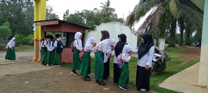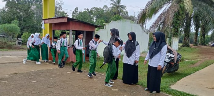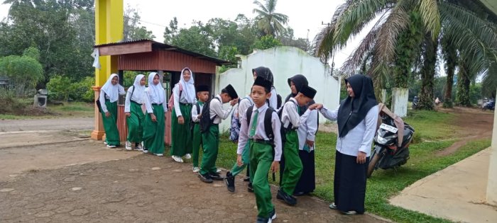 Para siswa tampak antusias hadir di madrasah dan siap mengikuti proses pembelajaran. Dewan guru yang bertugas pada hari itu antara lain Ibu Nurhidayah, S.Pd, Ibu Rahmawani Maghfirah, S.Pd, dan Ibu Ainun Mahmuda, S.Pd. Selain guru yang piket, beberapa guru lain juga turut hadir dalam kegiatan penyambutan, mencerminkan kekompakan dan rasa tanggung jawab yang tinggi di antara dewan guru. Kegiatan piket pagi dimulai sejak pukul 06.20 WIB. Guru-guru yang bertugas menyambut siswa dengan ramah, sementara para siswa berbaris rapi dan bersalaman dengan para guru sebelum memasuki lingkungan madrasah. Tradisi bersalaman ini telah menjadi kebiasaan yang dijaga setiap hari di MIN 1 Tebo, sebagai salah satu upaya menanamkan nilai sopan santun dan membangun hubungan yang baik antara siswa dan guru.