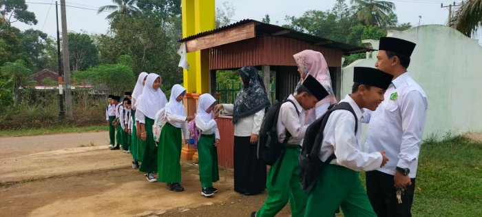 Pada hari ini, dewan guru yang bertugas di antaranya adalah Bapak Suyono, S.Pd, Ibu Suryanti, S.Pd.I, dan Ibu Nemawani, S.Pd.I. Selain guru yang mendapat jadwal piket, beberapa guru lain juga turut hadir untuk mengikuti kegiatan penyambutan. Hal ini menunjukkan kekompakan dan rasa tanggung jawab di antara dewan guru. Kegiatan piket pagi dimulai sejak pukul 06.20 WIB, di mana guru-guru menyambut siswa dengan ramah. Para siswa berbaris rapi dan bersalaman sebelum memasuki lingkungan madrasah. Tradisi bersalaman ini menjadi kebiasaan yang dijaga setiap hari di MIN 1 Tebo. Selain mempererat hubungan antara siswa dan guru, kegiatan ini juga menanamkan nilai sopan santun kepada siswa. Guru-guru yang bertugas juga mengingatkan pentingnya menjaga kebersihan lingkungan madrasah, baik di sekitar gerbang maupun di dalam kelas. Dengan demikian, siswa dilatih untuk bertanggung jawab terhadap lingkungan sekolah mereka.
