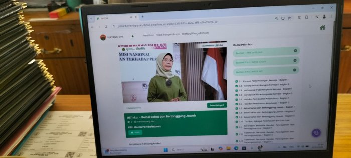 Para dewan guru Madrasah Ibtidaiyah Negeri (MIN) 1 Tebo mengikuti pelatihan pendidikan kesehatan reproduksi yang dilaksanakan secara daring melalui platform MOOC Pintar Kementerian Agama Republik Indonesia. Kegiatan ini berlangsung dari 5 hingga 9 Maret 2026 dan diikuti oleh para guru yang telah mendaftar sebelumnya. Pelatihan tersebut bertujuan untuk meningkatkan pemahaman guru mengenai kesehatan reproduksi, mencakup aspek fisik, mental, dan sosial. Materi pelatihan tidak hanya membahas kesehatan reproduksi bagi remaja dan masyarakat umum, tetapi juga memberikan pengetahuan khusus terkait kesehatan reproduksi untuk anak dengan disabilitas intelektual. Selain itu, pelatihan ini mengajarkan strategi menciptakan lingkungan pembelajaran yang ramah dan aman di madrasah.