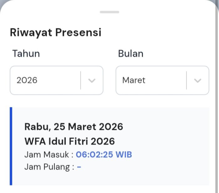 Pada Rabu, 25 Maret 2026, seluruh pegawai Madrasah Ibtidaiyah Negeri (MIN) 1 Tebo kembali menjalankan rutinitas sebagai Aparatur Sipil Negara (ASN) dengan melakukan pengisian absensi masuk dan pulang setelah libur Idulfitri 1447 H. Kegiatan ini dilaksanakan sesuai dengan Surat Edaran Sekretaris Jenderal Kementerian Agama Nomor 5 Tahun 2026 mengenai penyesuaian tugas kedinasan selama masa libur dan cuti bersama Idulfitri. Seluruh ASN MIN 1 Tebo diwajibkan melakukan absensi secara online melalui sistem Work From Anywhere (WFA). Sistem ini memungkinkan pencatatan kehadiran secara digital, sehingga pegawai dapat melapor kehadiran dari lokasi mana pun, baik dari rumah maupun tempat lain, tanpa harus hadir secara fisik di madrasah.