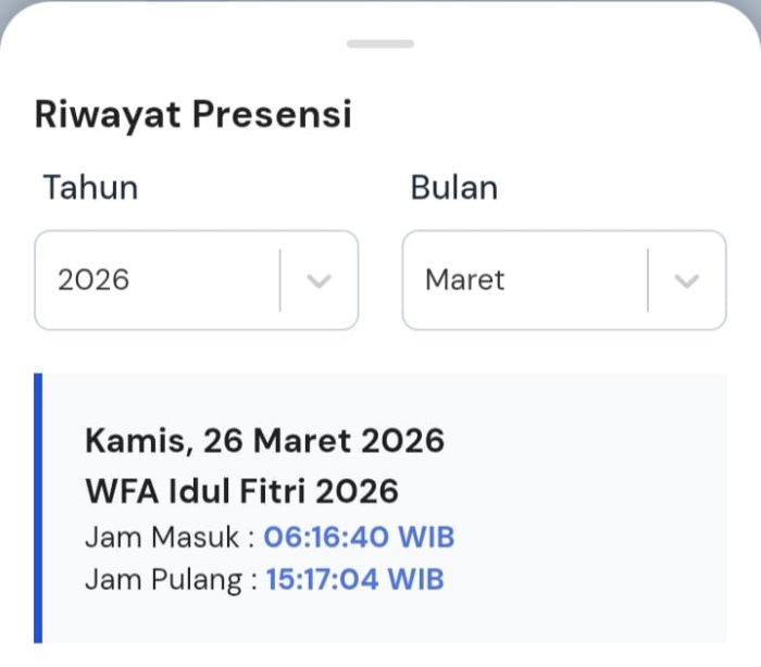 Seluruh pegawai Madrasah Ibtidaiyah Negeri (MIN) 1 Tebo kembali melaksanakan kewajiban pengisian absensi masuk dan pulang setelah libur Idulfitri 1447 H. Kegiatan ini berlangsung pada Kamis, 26 Maret 2026, menandai dimulainya kembali rutinitas sebagai Aparatur Sipil Negara (ASN) di lingkungan madrasah tersebut. Pelaksanaan absensi ini mengacu pada Surat Edaran Sekretaris Jenderal Kementerian Agama Nomor 5 Tahun 2026. Surat edaran tersebut mengatur penyesuaian tugas kedinasan selama masa libur dan cuti bersama sebelum dan sesudah Idulfitri 1447 H. Dalam surat edaran itu, seluruh ASN diwajibkan melakukan absensi secara daring melalui sistem Work From Anywhere (WFA). Pada hari ini merupakan pelaksanaan absensi yang kedua oleh seluruh ASN di MIN 1 Tebo pasca libur idul fitri ini berlangsung.