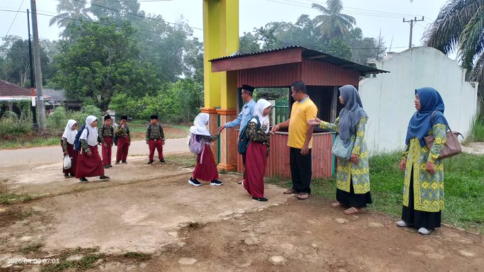 Pada hari tersebut, guru-guru yang bertugas antara lain Bapak Ariyanto, S.Pd.I, Ibu Siti Normawadah, S.Pd.I, Ibu Dharmawati, S.Ag, dan Ibu Falikhatus Saadah, S.Pd. Para dewan guru yang melaksanakan piket diwajibkan datang lebih awal agar pintu-pintu kelas sudah terbuka saat siswa tiba. Dengan demikian, siswa dapat langsung memasuki ruang kelas dan mempersiapkan diri untuk pembelajaran. Kegiatan piket pagi dimulai sejak pukul 06.30 WIB. Guru-guru menyambut siswa dengan ramah, sementara para siswa berbaris rapi dan bersalaman sebelum memasuki area madrasah. Tradisi bersalaman ini telah menjadi kebiasaan yang dijaga setiap hari di MIN 1 Tebo, sebagai upaya membangun kedekatan antara siswa dan guru serta menanamkan nilai sopan santun. Kepala MIN 1 Tebo, Bapak H. Ruslani, S.Pd., M.M, turut hadir memantau pelaksanaan penyambutan siswa. Beliau juga mengingatkan siswa yang membawa sepeda motor untuk memarkirkan kendaraan dengan rapi dan tertib di area parkir yang telah disediakan. Selain itu, para guru juga mengingatkan siswa untuk menjaga kebersihan lingkungan madrasah, baik di sekitar gerbang maupun di dalam kelas masing-masing.