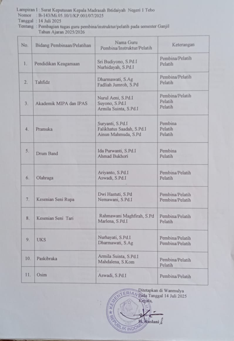 Ektrakurikuler MIN 1 Tebo yang aktif dilaksanakan di madrasah terdapat 4 macam yaitu ekstrakurikuler wajib dan pilihan. Ekstrakurikuler wajib yaitu kepramukaan dan ekstrakurikuler pilihan yang dikembangkan dan diselenggarakan sesuai bakat dan minat peserta didik. Adapun eksrakurikuler yang dikembangkan Drumband, kesenian dan olahraga.